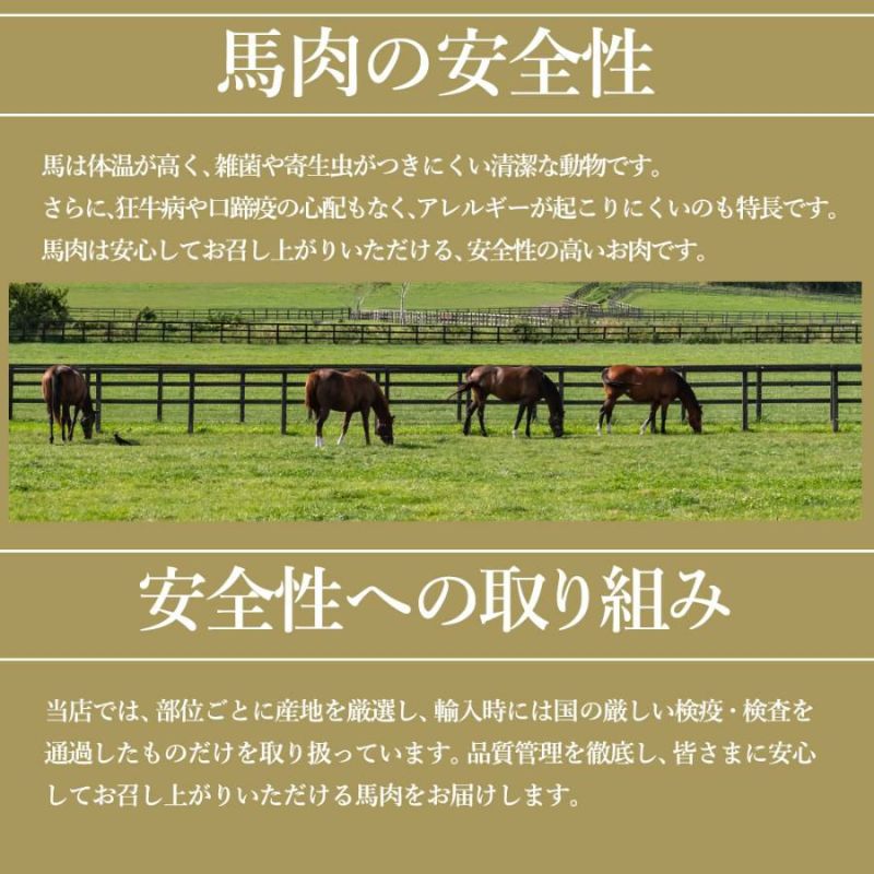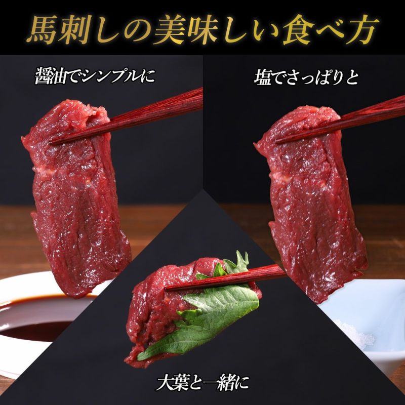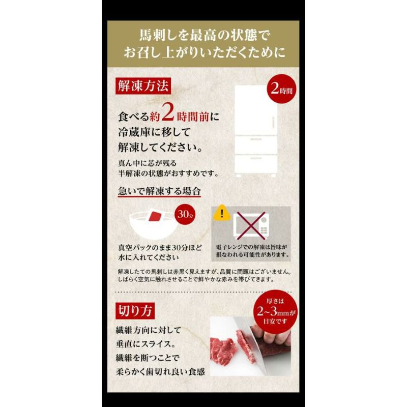 ・鮮度そのまま真空パック:加工後すぐに真空パックし、馬刺し本来の旨味と食感を新鮮なままお届けします。