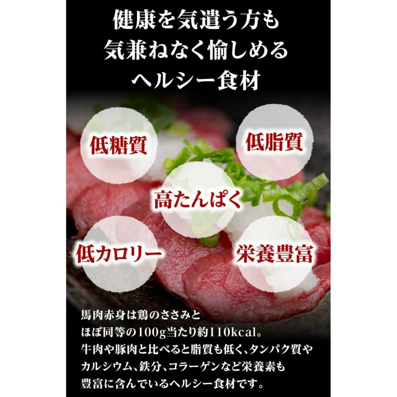 鮮度が命の馬刺し赤身 なめらかな舌触りと濃厚な旨味をお楽しみください。 ・食べきりサイズ:1パック100gなので一人でも十分に食べきることが出来ます。 ・ヘルシー食材:低カロリー、高たんぱくで健康に気を遣っている方も安心して食べられます。 ・ 鮮度を逃さない真空パック:濃厚な旨味を鮮度を落とさずお届けいたします。