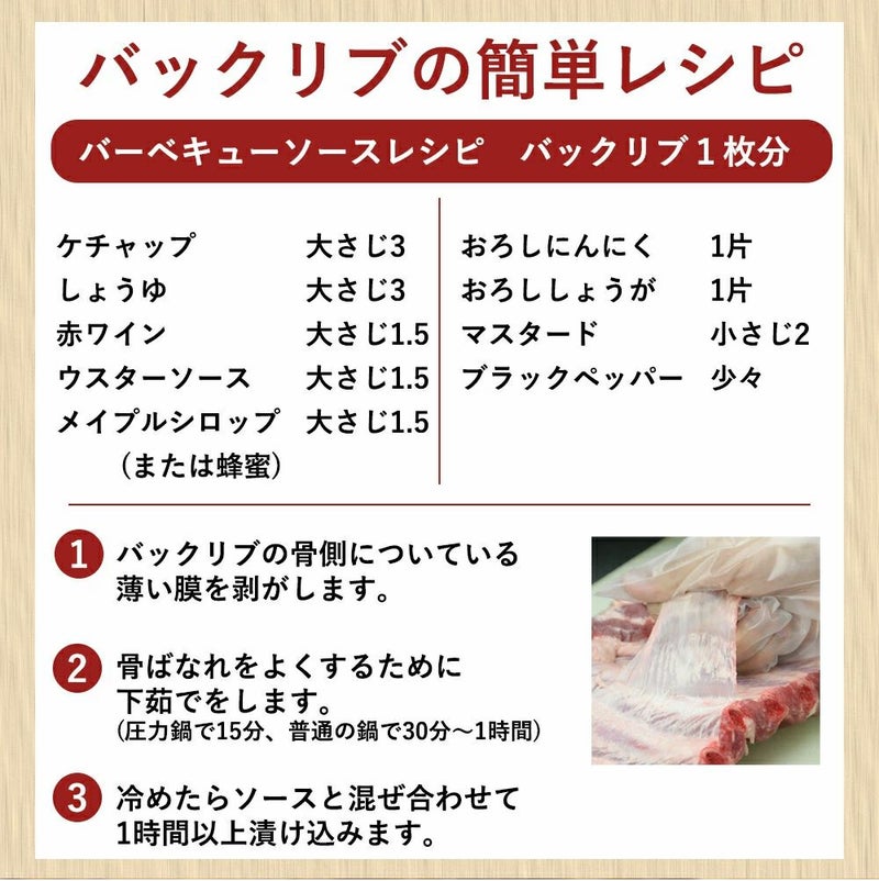 原料肉加工地 アルバータ州 商品製造地 アルバータ州 規格・内容 カナダ産骨付き豚あばら肉(バックリブ)1枚 賞味期限 製造日より1年10ヶ月 保存方法 冷凍 発送方法 ヤマトクール便 召し上がり方・取扱い上の注意 解凍後、中心部まで十分に加熱してお召し上がりください。 原材料名 カナダ産ポークバックリブ 販売者 株式会社フーズアイ 広島県広島市西区草津港1-6-10