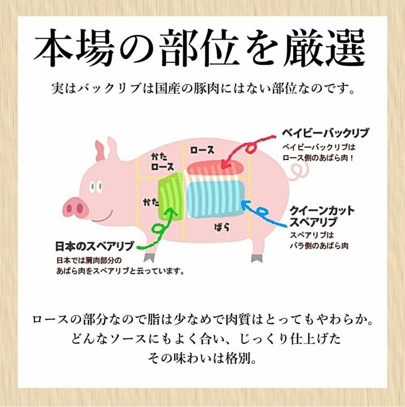 原料肉加工地 アルバータ州 商品製造地 アルバータ州 規格・内容 カナダ産骨付き豚あばら肉(バックリブ)1枚 賞味期限 製造日より1年10ヶ月 保存方法 冷凍 発送方法 ヤマトクール便 召し上がり方・取扱い上の注意 解凍後、中心部まで十分に加熱してお召し上がりください。 原材料名 カナダ産ポークバックリブ 販売者 株式会社フーズアイ 広島県広島市西区草津港1-6-10