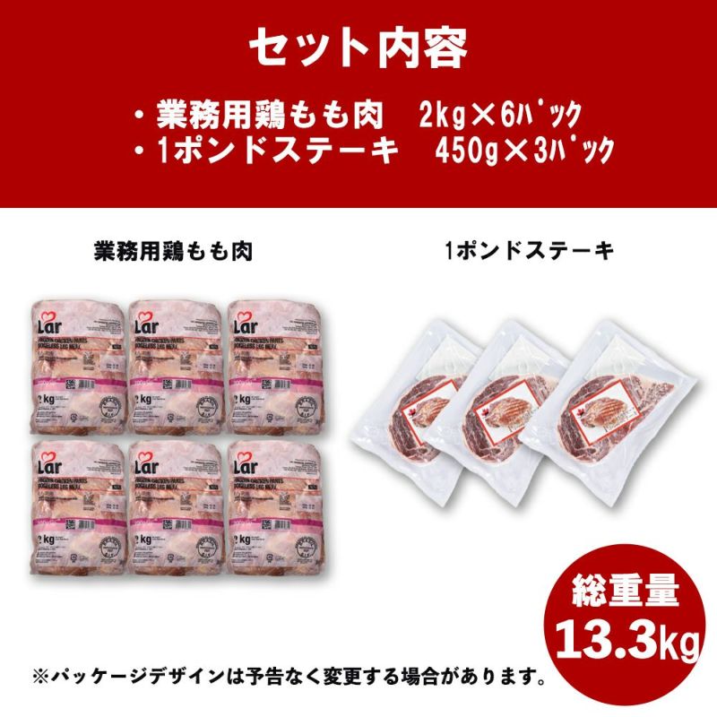 肉好き必見!大容量! ・満足感たっぷり:総量13.3kg。 ・お得な2種:使い勝手抜群のリブロース、鶏ももをセットにしました。 ※本商品は数量限定の特価販売品のため、お一人様1セットまでのご購入とさせていただきます。あらかじめご了承ください。